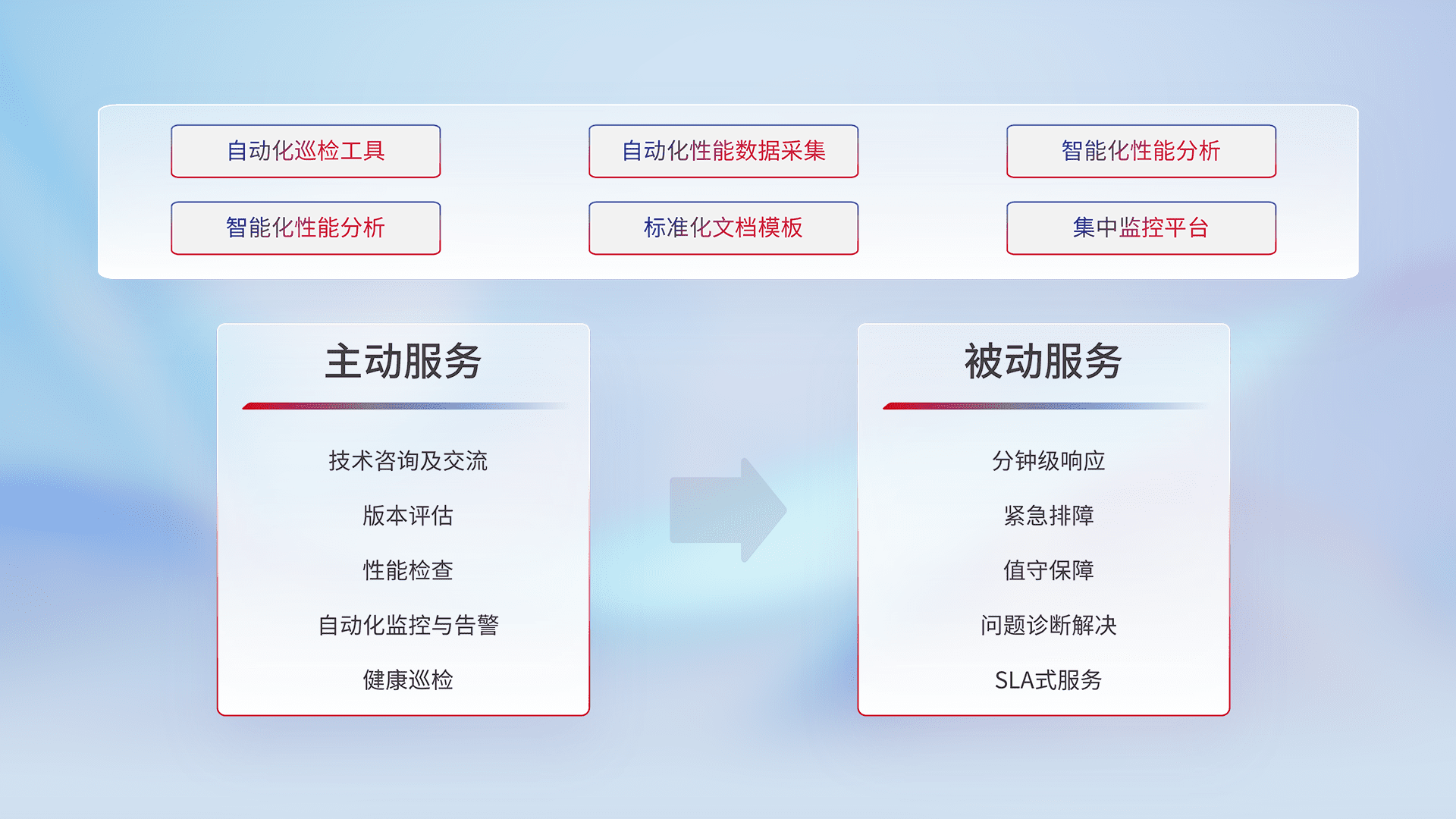 智能化工具和标准化文档,,保障服务质量,,,提供主动服务(包含技术咨询、、版本评估、、、、性能检查、、自动化监控与告警、、、、健康巡检)和被动服务包含(分钟级响应、、、、紧急排障、、、、值守保障、、、、问题诊断解决、、、SLA服务)。。。。